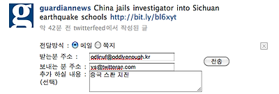 - 메일: 트윗 내용을 상대방 이메일로 보낼 수 있습니다. “받는 분 주소”와 “보내는 분 주소”를 채우고 “전송” 버튼을 클릭하면 이메일이 발송됩니다.