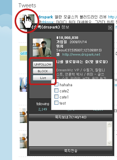 - 사이드바의 following을 선택해서 리스트에 포함된 사람 혹은 리스트를 follow하는 사람들에게 쪽지를 보내거나 unfollow, block, 스팸신고 등을 할 수 있습니다.