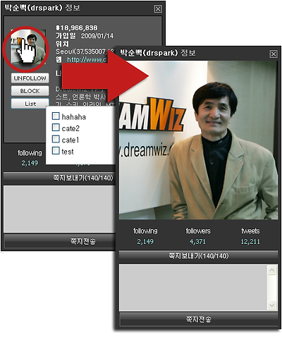 타임라인에 있는 프로필 사진을 클릭하면 상대방 정보가 나타나는데, 이 창에서 해당 사용자를 unfollow, block은 물론 프로필 확인도 하고 간편하게 쪽지를 보낼 수 있습니다.