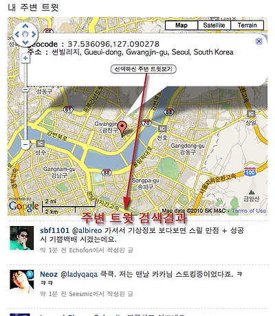 특정 위치 주변에 있는 트위터 사용자의 위치정보를 검색함으로써 검색할 수 있습니다. 트위터에서 “Settings>account>enable geotagging”을 선택하면 해당 사용자가 트윗을 올린 곳의 위치정보가 공개됩니다. 내 주변 트윗에서는 위치정보를 공개한 사용자들이 올린 트윗 중 자신이 지도상에 지정한 특정 위치 근처에서 올린 것만을 확인할 수 있습니다.
