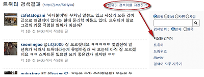 자신이 주로 검색하는 단어를 저장해서 나중에 다시 입력해야 하는 불편을 덜 수 있습니다. 우선, 저장하고 싶은 검색어를 입력하고 검색합니다. 왼쪽 타임라인에 검색결과가 나타나고 타임라인 왼쪽 위를 보면 “검색어를 저장하기”라고 표기되어 있습니다. 이것을 클릭하면 해당 검색어가 저장되고 “저장한 검색어” 밑에 나타나며, 이렇게 저장한 검색어를 클릭만 하면 검색결과가 표시됩니다.