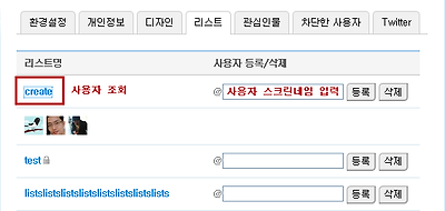 - 사용자 스크린네임을 넣고 등록이나 삭제 누르시면 되며 리스트명을 클릭하시면 해당 리스트에 등록 되어있는 사용자를 조회하실수 있습니다.