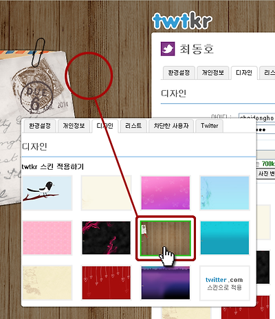 - twitter.com 스킨 적용하기: ※twtkr이 기본으로 제공하는 배경 그림 선택하시면 twtkr 에서만 보이며 twitter.com 에 스킨을 사용 하시고 싶으시면 twitter.com 스킨으로 적용 선택하시면 됩니다.