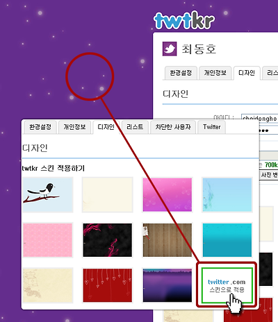 - twtkr 스킨 적용하기: twtkr 스킨 적용하기 버튼을 클릭 하시면 사용자가 지정한 옵션이 적용 됩니다.