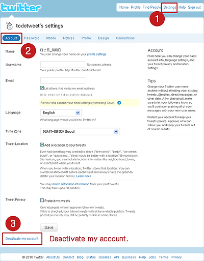 - 트위터 홈페이지 에서 ①setting > ②Account > ③Deactivate my account. 클릭하면 탈퇴가 완료됩니다.