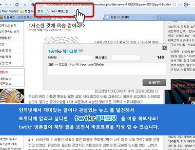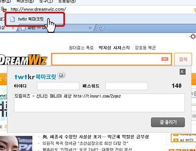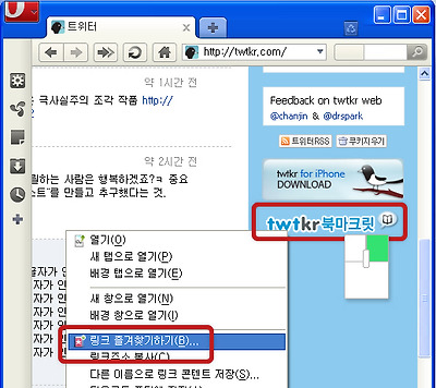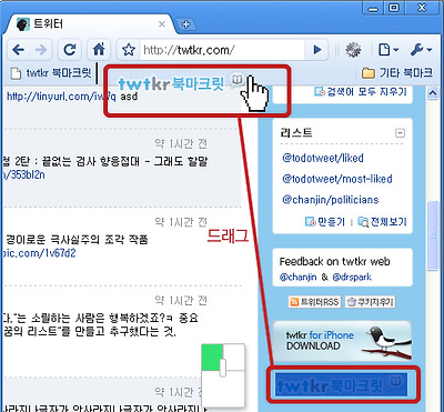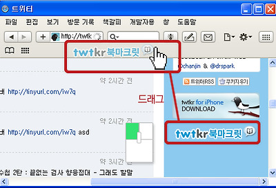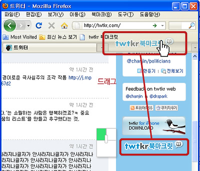 twtkr 홈에서 북마크릿 글자에 마우스 왼쪽을 클릭 한 상태에서 브라우저 상단에 (아래 이미지 처럼 ) 끌어다 놓으시면 됩니다.