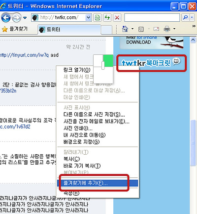twtkr 홈에서 북마크릿 글자에 마우스 오른쪽을 클릭 한 다음 "즐겨찾기 에 추가" 를 하시면 됩니다.