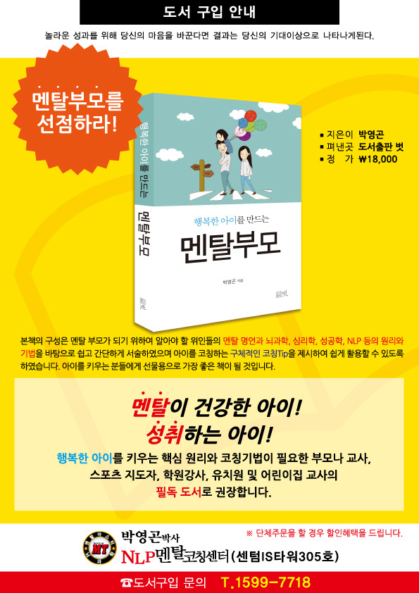 행복한아이를만드는 멘탈부모 도서구입안내 작성자NLP멘탈코칭센터|작성시간16.08.10|조회수29 목록 댓글 0 글자크기 작게가 글자크기 크게가 다음검색 현재 게시글 추가 기능 열기 북마크 공유하기 신고 센터로 신고 댓글 댓글 0 댓글쓰기 댓글 리스트