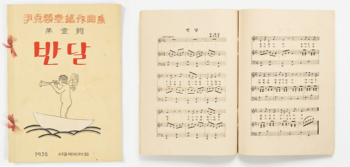 ▲ 한국 첫 창작 동요집 ‘반달’ 표지(왼쪽). 윤극영이 작곡한 동요 10곡이 실린 동요집으로, 여기에 동요 ‘반달’ 악보