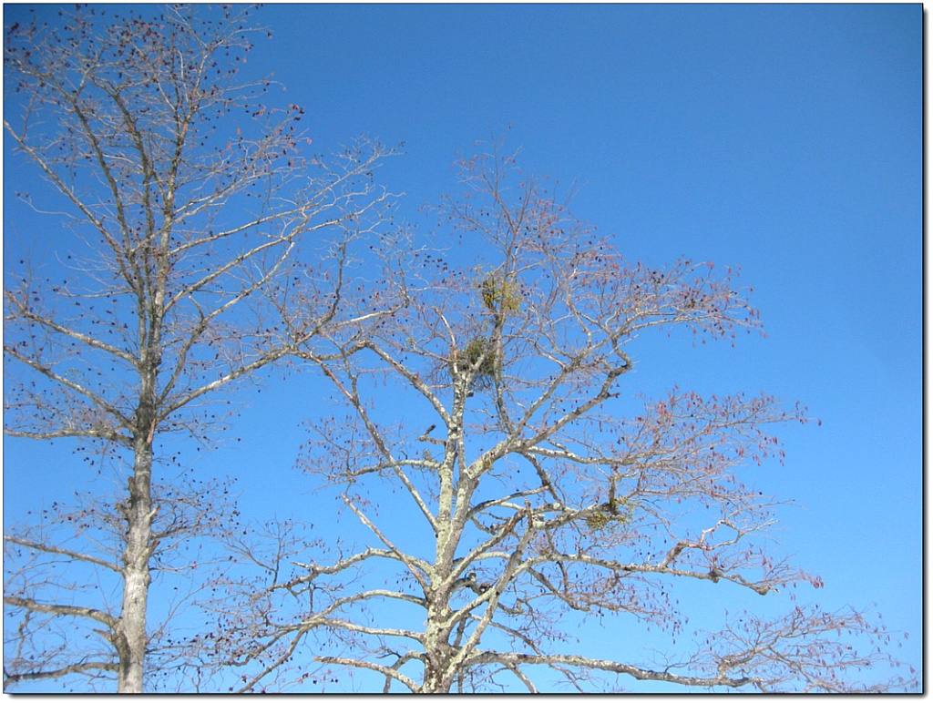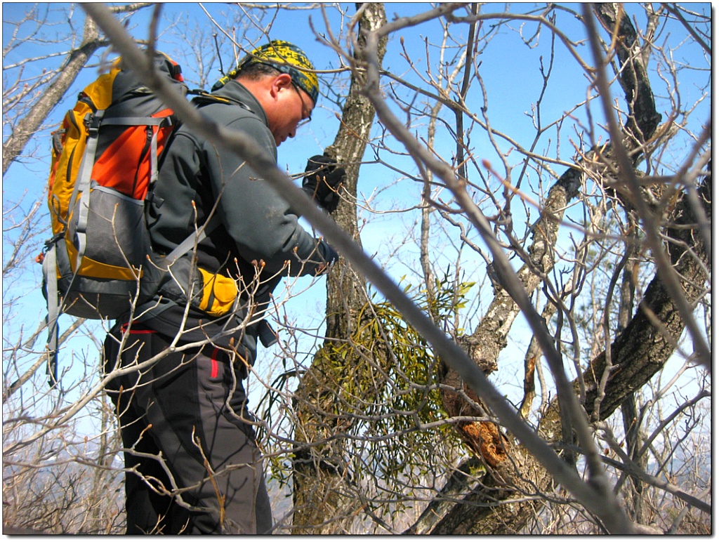 겨우살이가 높지 않은 곳에 기생하고 있습니다. 그냥 갈 수가 없었어^