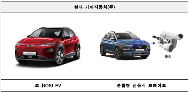 현대자동차㈜에서 제작, 판매한 코나 전기차(EV) 에서는 전동식 브레이크 시스템의 소프트웨어 결함으로 브레이크 경고등 점등 시 브레이크 페달이 무거워져 제동이 제대로 되지 않을 가능성이 확인되어 시정조치(리콜)에 들어간다.