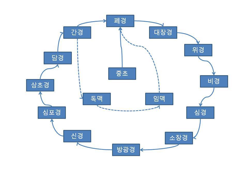 - 유주(流注): 수태음폐경에서 시작해서 족궐음간경에서 끝나며 각 경맥은 끊임없이 반복해서 순환한다.