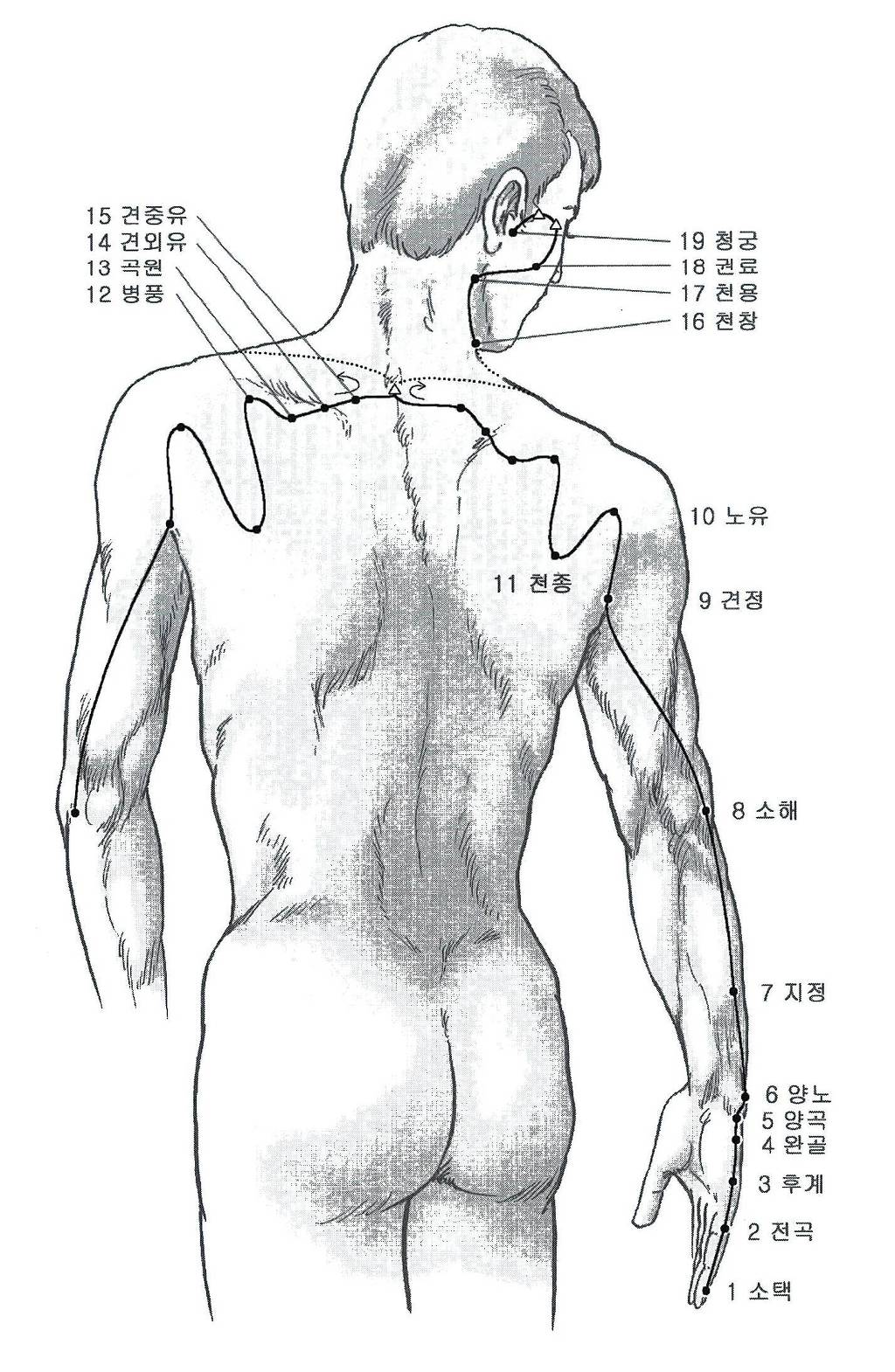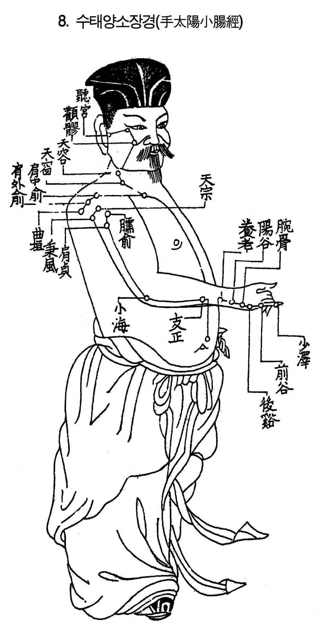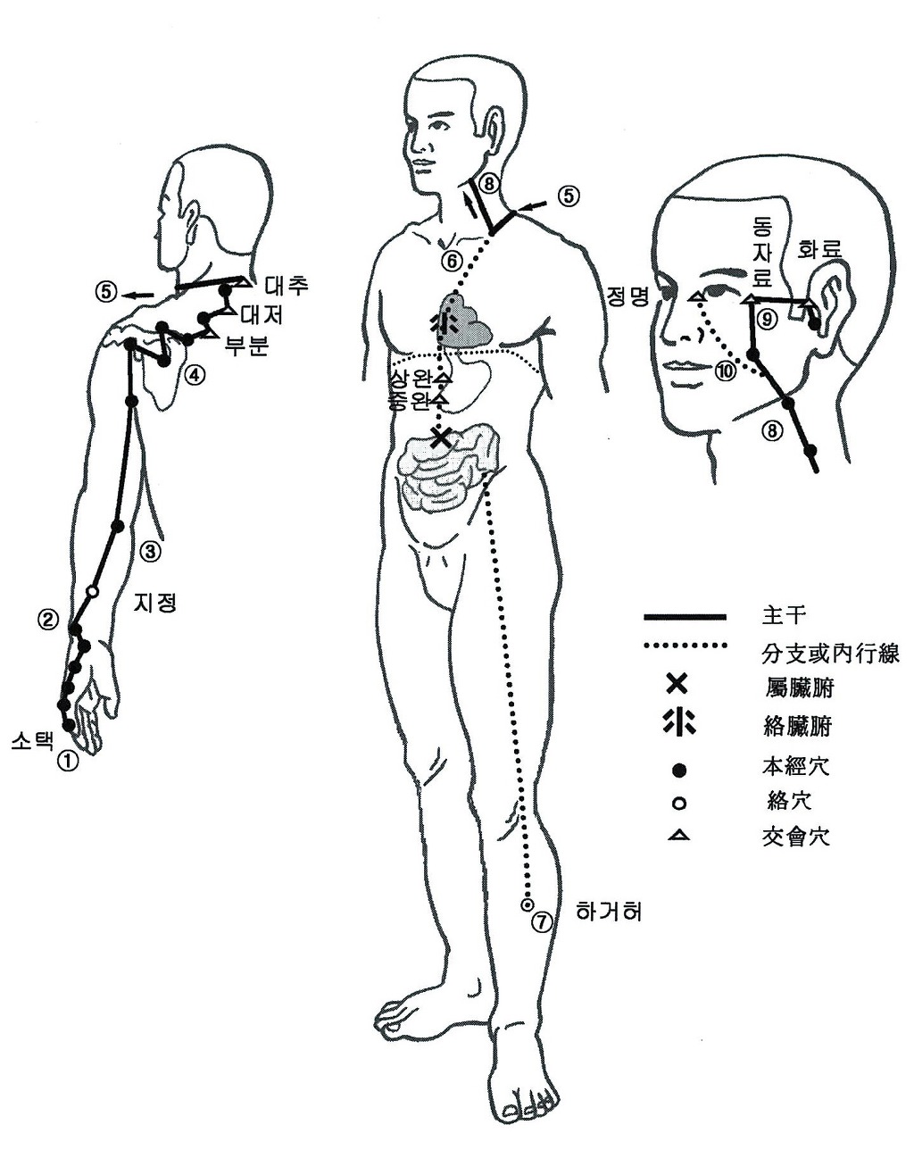 1) 순행개요: 이경은 새끼손가락 척측(바깥쪽) 소택혈에서 시작해서 손등과 팔의 외측 후연을 따라 팔꿈치를 지나 견관절 뒷면에 도달해서 견갑 부위를 휘돌아 좌우가 서로 교차해서 독맥의 대추혈에서 만난다. 앞 결분으로 들어가 체강으로 깊숙이 들어가 심에 이어진다(絡). 식도를 따라 흉격을 지나 위에 도달해서 아래로 내려가 소장에 속한다. 한 분기(갈라진 가닥)는 얼굴 뺨으로 나와 눈 아래로 올라가 안쪽 눈초리 에 이르고 정명혈에서 경기는 족태양방광경과 만난다. 관련 장부기관은 소장, 심, 위, 목구멍(咽), 귀, 눈안팎꼬리(目內外眦), 코이다.