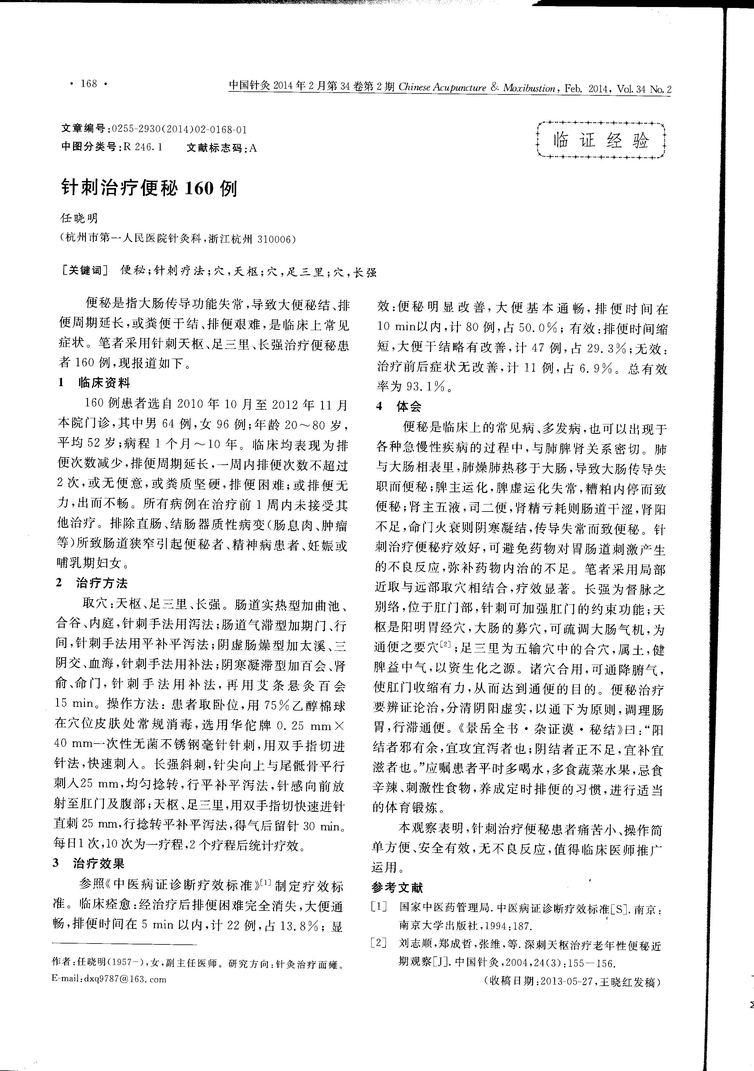 변비는 대장이 전도(傳導) 기능을 상실해서 변이 딱딱해지고, 배변 주기가 길어지거나, 변이 마르고 배변이 어려운 상태를 말한다. 이는 흔한 임상 증상이다. 저자는 천추, 족삼리, 장강에서 침술을 사용하여 변비 환자 160례를 치료하였고, 그 결과를 다음과 같이 보고한다.