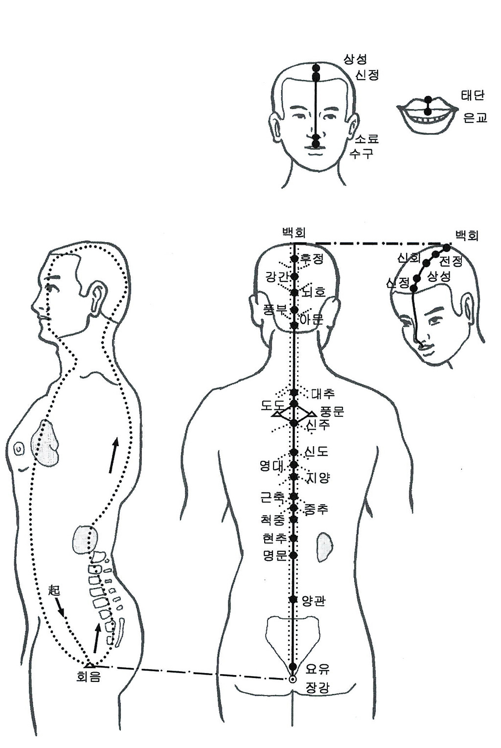 독맥 督脉(督脈) dūmài | Governor Channel, Governor Vessel | 起于胞中,下出会阴,沿脊柱里边直向上行,至项后风府穴处进入颅内,络脑,并由项沿头部正中线,上行颠顶,沿前额正中,鼻柱正中,至上唇系带处。 | 포중(뱃속, 인체 생명의 근원)에서 시작해 회음으로 내려가서 척주 속을 따라 위로 올라간다. 목덜미 뒤 풍부혈에서 두개골로 들어가 뇌에 연결되고 두부의 정중선을 따라 정수리로 올라간다. 앞이마 가운데와 비골 가운데를 따라 윗입술에 이른다. |