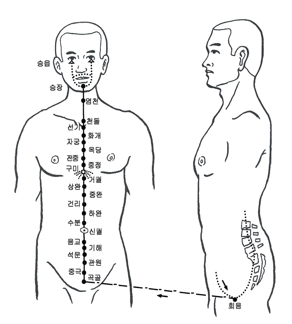 임맥 任脉(任脈) rènmài | Conception Channel, Conception Vessel | 起于胞中,下出会阴,向上前行至阴毛部位,沿腹部和胸部正中线直上,经咽喉,至下颌,环绕口唇,沿面颊,分行至目眶下。 | 포중에서 시작해 회음으로 내려가서 음모 부위를 향해 앞쪽으로 올라간다. 복부와 흉부 정중선을 따라 곧바로 올라가 인후를 거쳐 아래턱에 이른다. 입술을 휘돌아 뺨을 따라 눈자위 아래로 나뉘어 간다. |