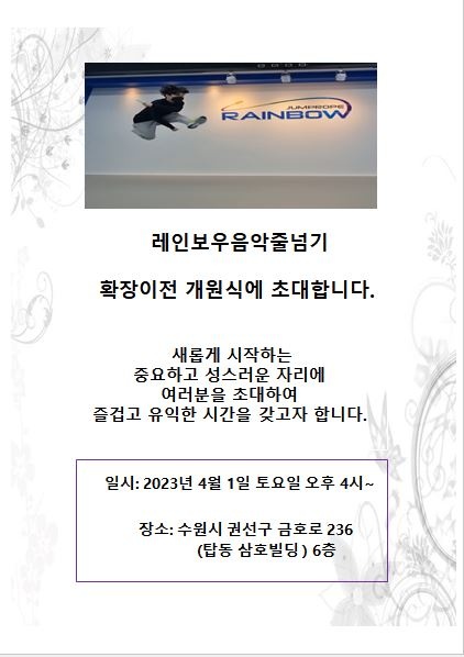 한마음 유기상 회장님댁 줄넘기 학원 확장 개원 작성자박충석|작성시간23.03.28|조회수93 목록 댓글 0 글자크기 작게가 글자크기 크게가 다음검색 현재 게시글 추가 기능 열기 북마크 공유하기 신고 센터로 신고 댓글 댓글 0 댓글쓰기 답글쓰기 댓글 리스트