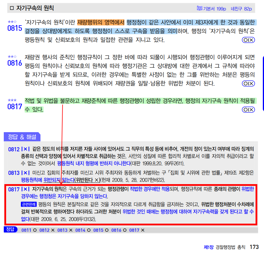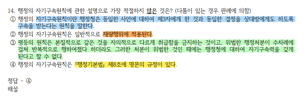 예를 들어 이번 26년 1차 시험에 14번 문제에서 4번 정답 선지로 '자기구속의 원칙이 행정기본법에 명문 규정이 있는지?' 라는 논점이 문제로 출제되었는데, 너무 쉬운 문제이지만 시험장에서 떠오르지 않거나 틀리고 오는 학생분들이 많습니다.