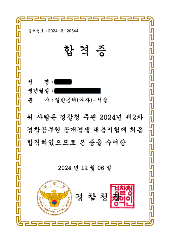 포기하지 마세요. 열 번 찍어 안 넘어가는 나무는 없습니다. 허수로서 본 시험까지 도합 9번의 시험을 봤습니다. 그리고 10번째인 2024년 2차 시험 때, 처음으로 필기합격을 했습니다. 필기시험 합격 후, 처음 체력학원에 갔을 때, 서울청 여자 수험생 중 유일하게 팔굽혀 펴기 수가 0개였습니다. 진심으로, 차라리 체력을 더 키워서 다음 시험을 준비해야겠다는 생각이 들었습니다. 하지만 처음으로 잡게 된 필합의 기회를 놓치고 싶지 않았습니다. 그래서 매일 밴드 팔굽 300개씩을 하고 집에 갔습니다. 그 결과 실제 시험에서는 30개로 9점을 받았습니다. 열심히 노력했지만, 1배수 합격 컷으로 필합 했던 저는, 체력 시험까지 반영한 환산점수로 배수 밖으로 밀려났습니다. 환산점수 –1이었던 저는, 최대한 긍정적인 생각을 하며 열심히 면접 준비를 했습니다. 그 결과, 최종합격이라는 좋은 결과를 얻을 수 있었습니다. 그러니, 여러분, 절대로 포기하지 마세요. | |