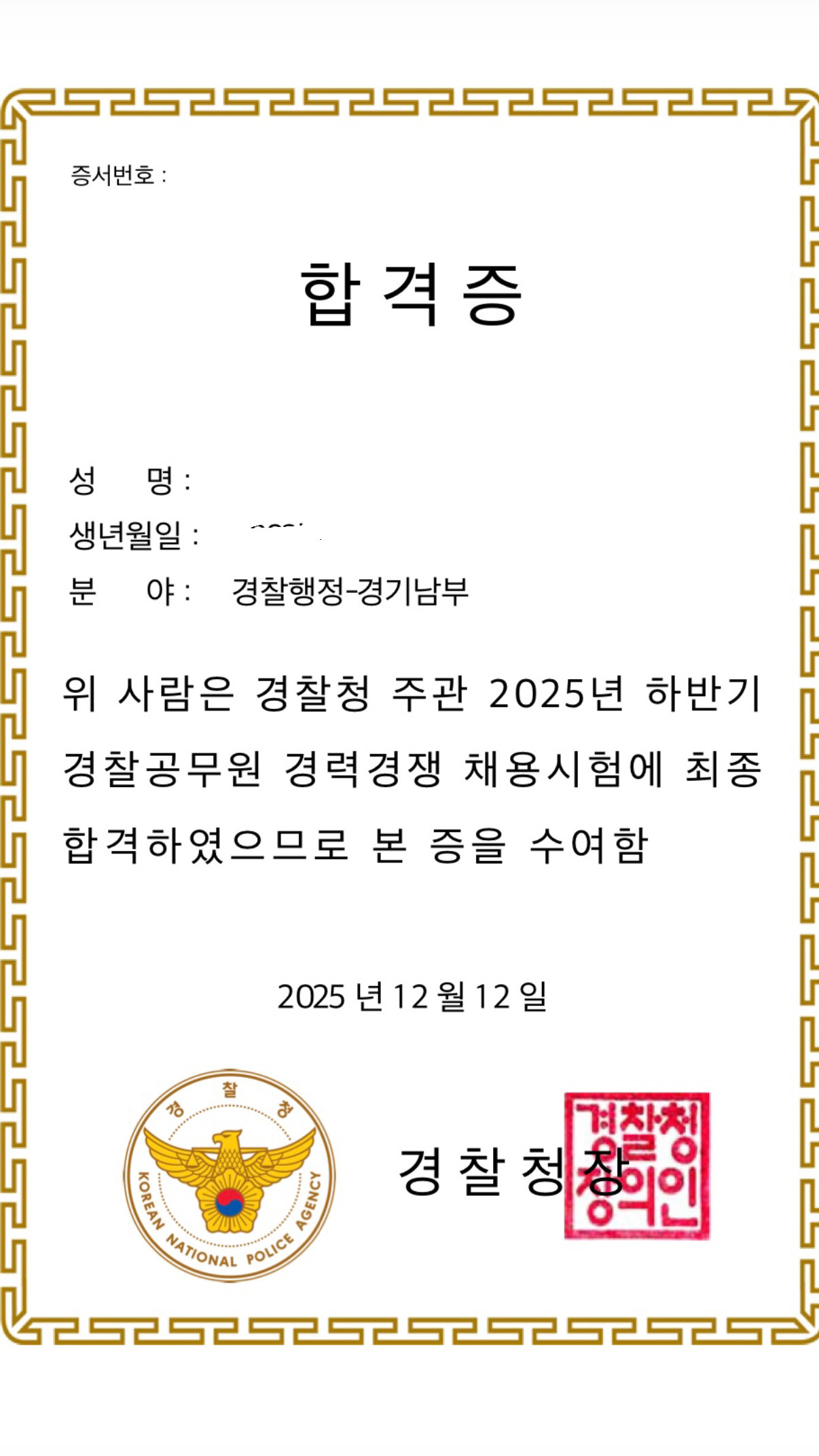 | 필기시험과 체력시험, 그리고 면접 준비 과정을 거치며 단순히 시험을 준비하는 것을 넘어 많은 가르침과 배움을 얻을 수 있었습니다. 수험기간 동안 포기하고 싶었던 순간도 있었고, 불안과 긴장 속에서 스스로를 돌아보는 시간도 많았습니다. 하지만 그 모든 과정이 경찰이라는 직업을 더욱 진지하게 생각하게 만드는 소중한 경험이었다고 생각합니다. 이러한 경험 속에서 쌓은 초심을 잊지 않고 끊임없이 성장해 나가는 자랑스러운 경찰이 되겠습니다. | |