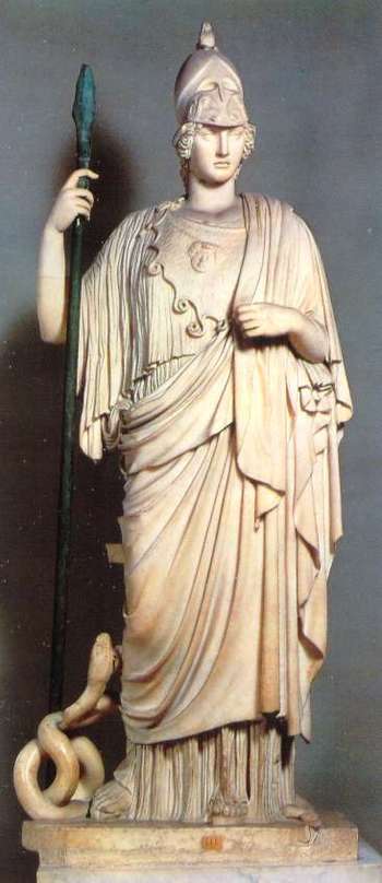 그리스 신화 속의 전쟁과 지성(知性)의 여신. 아테네의 수호신이다. 제우스와 해신(海神) 오케아노스의 딸 메티스 사이에 태어났으며, 올림포스 12신(神) 가운데 하나이다. 메티스가 임신하였을 때 지신(地神) 가이아가, 메티스에게서 태어나는 아들이 제우스의 지위를 빼앗을 것이라고 하는 소리를 듣고, 제우스는 메티스를 삼켜버렸다. 그런데 태어날 시기가 되었을 때 심한 두통을 못견딘 제우스가 프로메테우스(일설에는 헤파이스토스)에게 도끼로 자신의 머리를 쪼개달라고 부탁하였는데, 그대로 머리를 쪼개자 그 속에서 아테나가 갑옷을 입은 모습으로 함성을 지르면서 태어났다고 한다. 아레스가 남성 전쟁신(戰爭神)인 데 비해 아테나는 전쟁의 여신으로 알려졌다. 이는 여신이 원래 선주민족의 신으로서 아크로폴리스의 성채(城砦)에 모셔진 데서 유래한다. 정복자인 그리스인도 이를 이어받아 아테나이(아테네)를 대표하여 국가와 국가의 운명을 좌우하는 영웅들을 지키는 여신으로 모셨다. 일반적으로 염소의 가죽으로 만들어지고 괴물 고르곤의 목이 한가운데에 달린 신성한 공격용 방패인 아이기스를 든, 무장한 처녀의 모습으로 상징되고 있다. 올빼미가 여신의 상징으로 되어 있었는데, 이것도 옛날의 수신(獸神)숭배에서 유래한 것으로 생각된다. 전차(戰車)를 비롯한 많은 무기를 발명한 여신으로 알려졌으나, 한편 여성이 맡은 일의 신으로서 방적(紡績)과 기직(機織)의 신이기도 하였다. 뿐만 아니라 도기(陶器)와 금세공(金細工) 등, 수공업을 중심으로 하는 여러 가지 기술의 여신으로도 알려졌는데, 마침내는 지력(知力)의 권화(權化)로 보기에 이르렀다. 또한 포세이돈과 아티카의 땅을 놓고 싸울 때 포세이돈이 아크로폴리스 기슭에 염수(鹽)의 못을 만들어낸 데 비해, 그녀는 아크로폴리스의 언덕에 올리브 나무를 자라게 함으로써 승리하였는데, 그 후로는 그녀를 올리브의 여신이라고 하였다. 그녀는 팔라스라고도 불리며, 로마 신화의 미네르바, 이집트 신화의 네이트와 동일시되고 있다