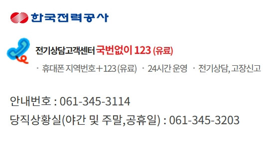 | 한전 고객센터 | 123 | 24시간 |