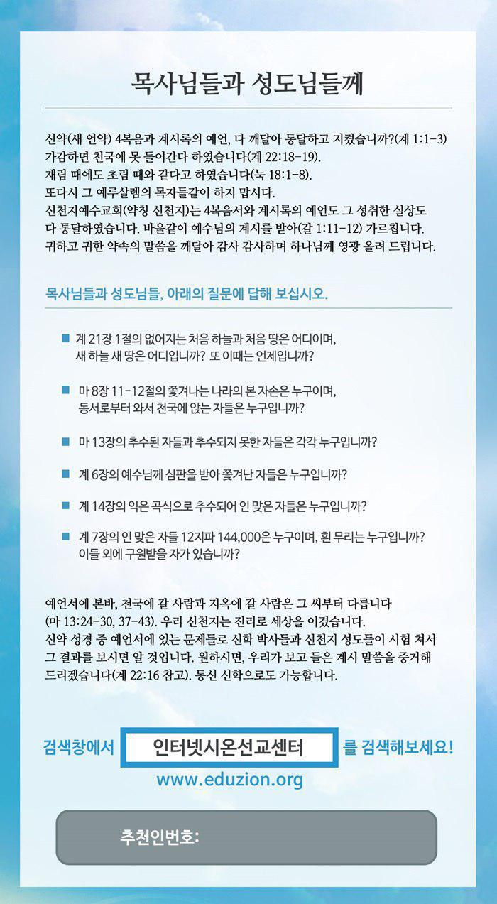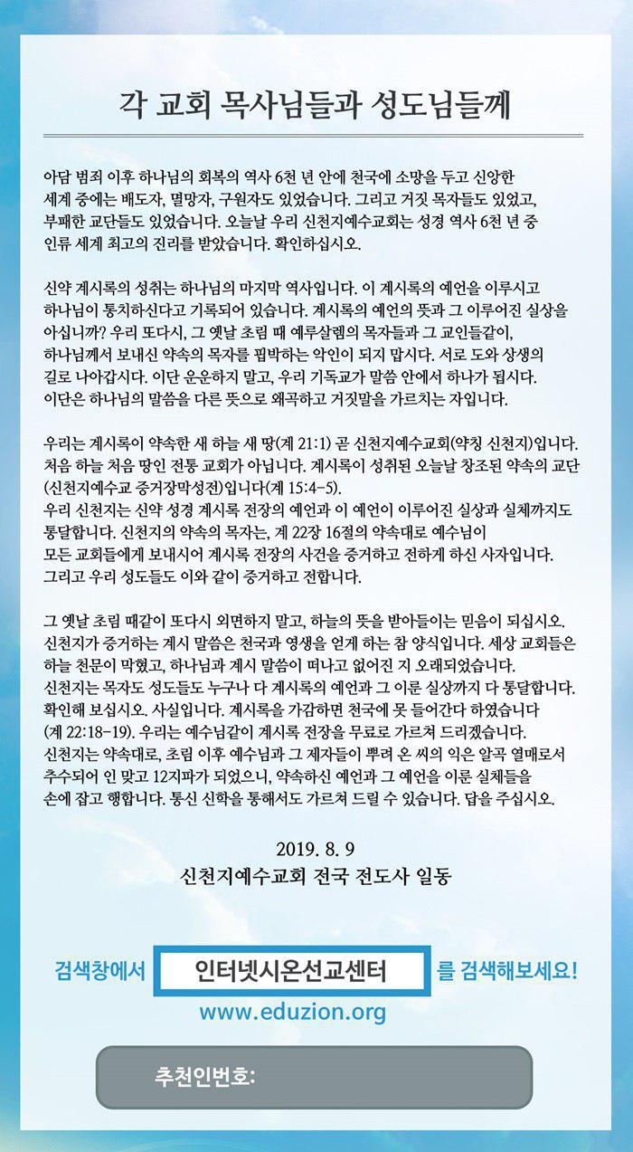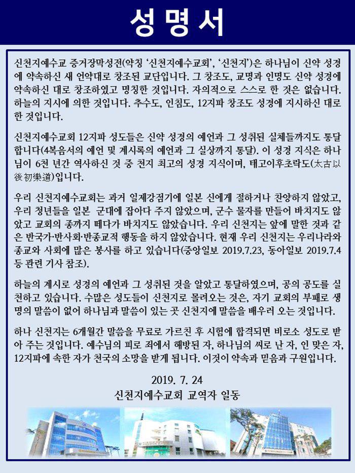 요즘 천국가고 싶은 사람들이 몰려가는 신천지예수교회 성명서를 통해 소개 합니다.