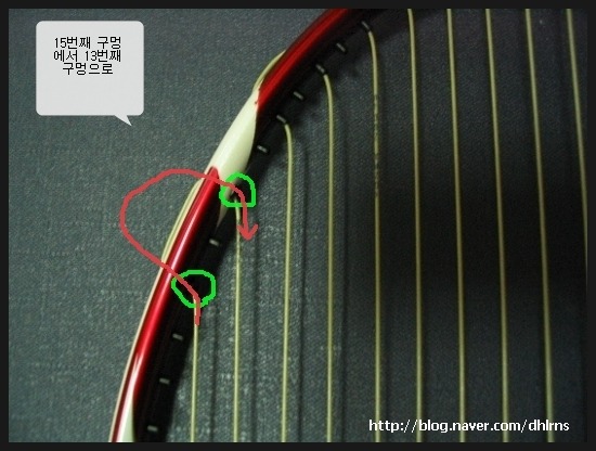 아래 12번째에서 나온 거트는 위에 15번째 구멍으로 갑니다.