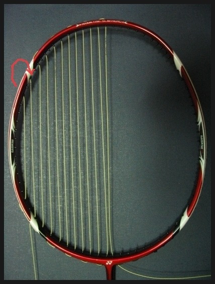 라켓의 5번째 구멍에서 매듭을 지어서 거트를 엮을때 줄이 빠지지 않도록합니다.