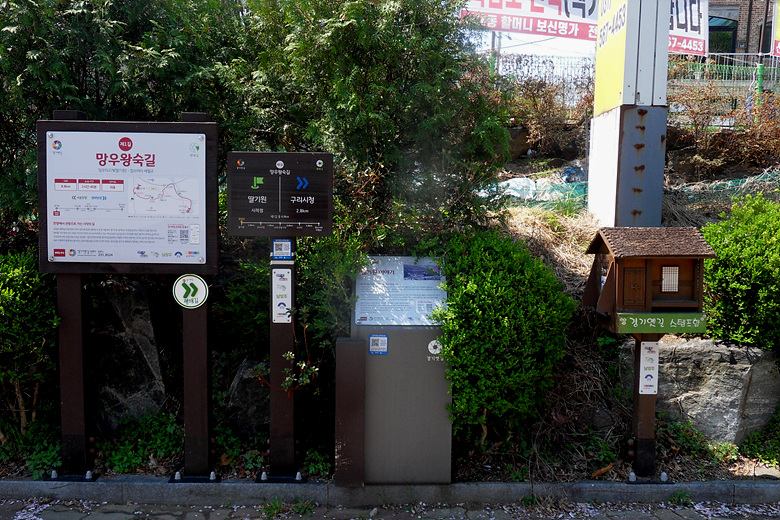 딸기원 정류장에 내려서 망우고개 방향인 상덕마을입구 제 1길 망우왕숙길 안내판과