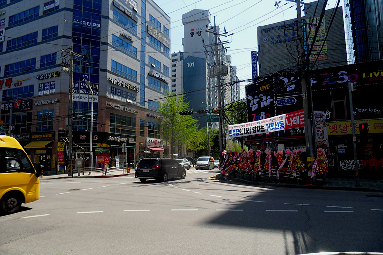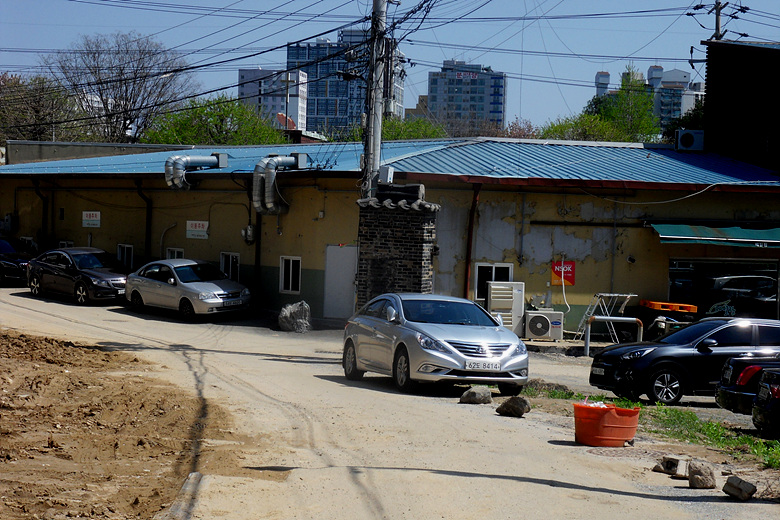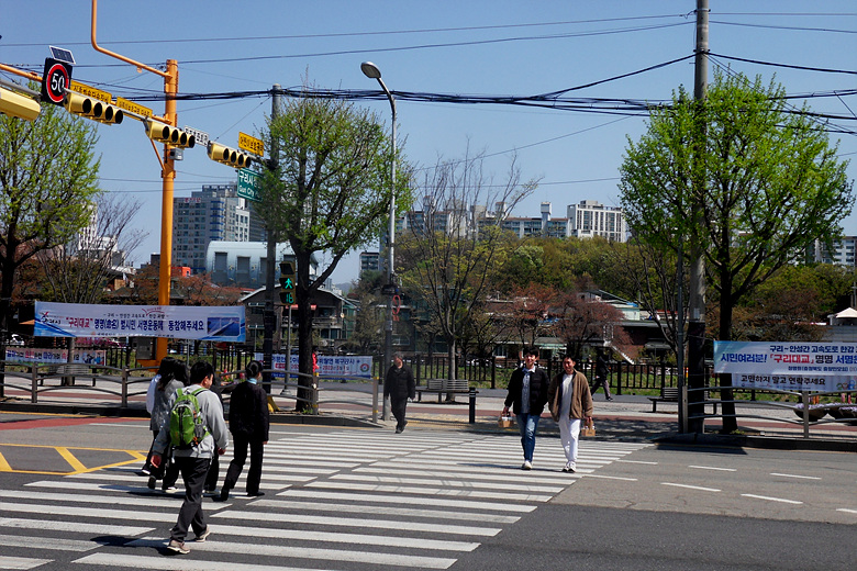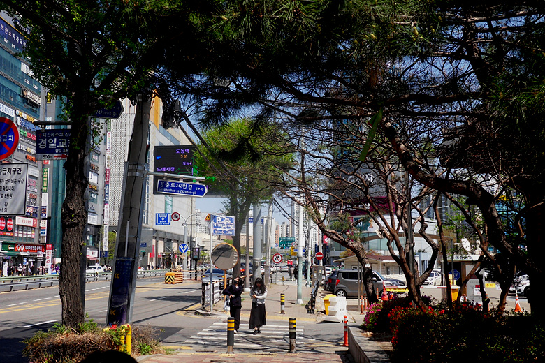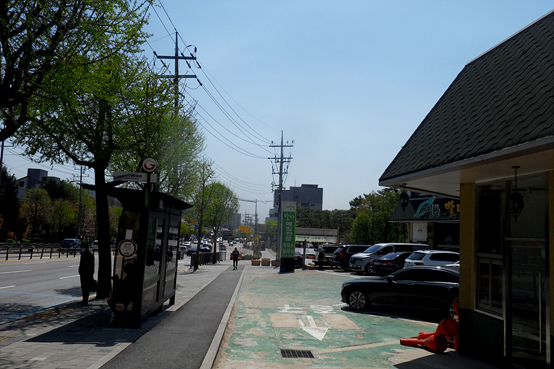 백송(흰소나무)한구루가 힘겹게 서있는 소로를벗어나 구리시청앞 횡단보도