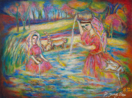 물의 신화 - 샘- 多情하여 물의 여신이 되었는가 타는 갈망 물방울로 적시는 푸른 변주곡 이고 온 항아리 꿈을 담고 홀로 솟아나 저문 날 숲으로 가리우는 너, 그리운 몸 시인화가 박정해