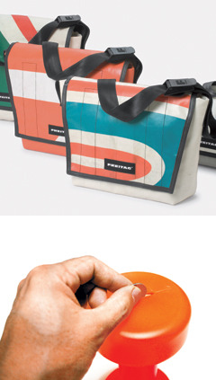 트럭덮개는 강한 비바람으로부터 적재물을 보호하기 위해 튼튼한 방수 천을 쓴다. 스위스의 디자이너들이 만든 '프라이탁(Freitag)'이라는 가방은 낡은 트럭덮개로 만들어졌다. 이 가방의 특징은 튼튼하고 예쁘지만 일정한 디자인이 없다는 것. 트럭덮개는 각 기업의 로고나 칼라가 인쇄돼 있고, 낡은 정도도 각각 다르기 때문이다. 자동차용 안전벨트가 가방끈이다. 선보인 지 10여년 된 이 프라이탁이 요즘 전 세계 패션 리더들 사이에 인기 폭발이다. 일본에서는 물론 아직 수입선이 없는 국내에서도 이 가방의 인기가 높아지고 있다.