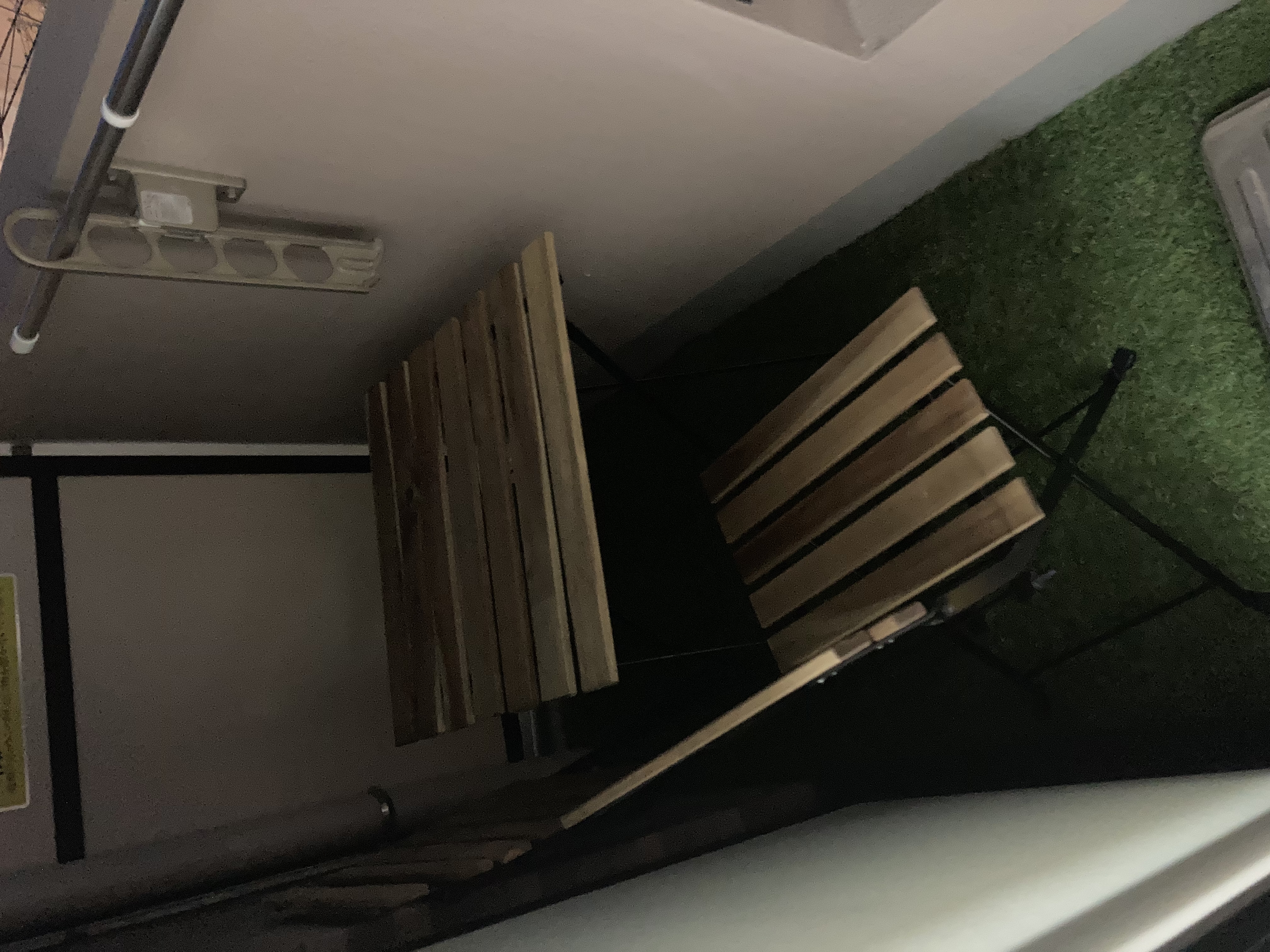 삭막한 발코니에 인조잔디를 깔고 테이블과 의자를 놓았습니다.