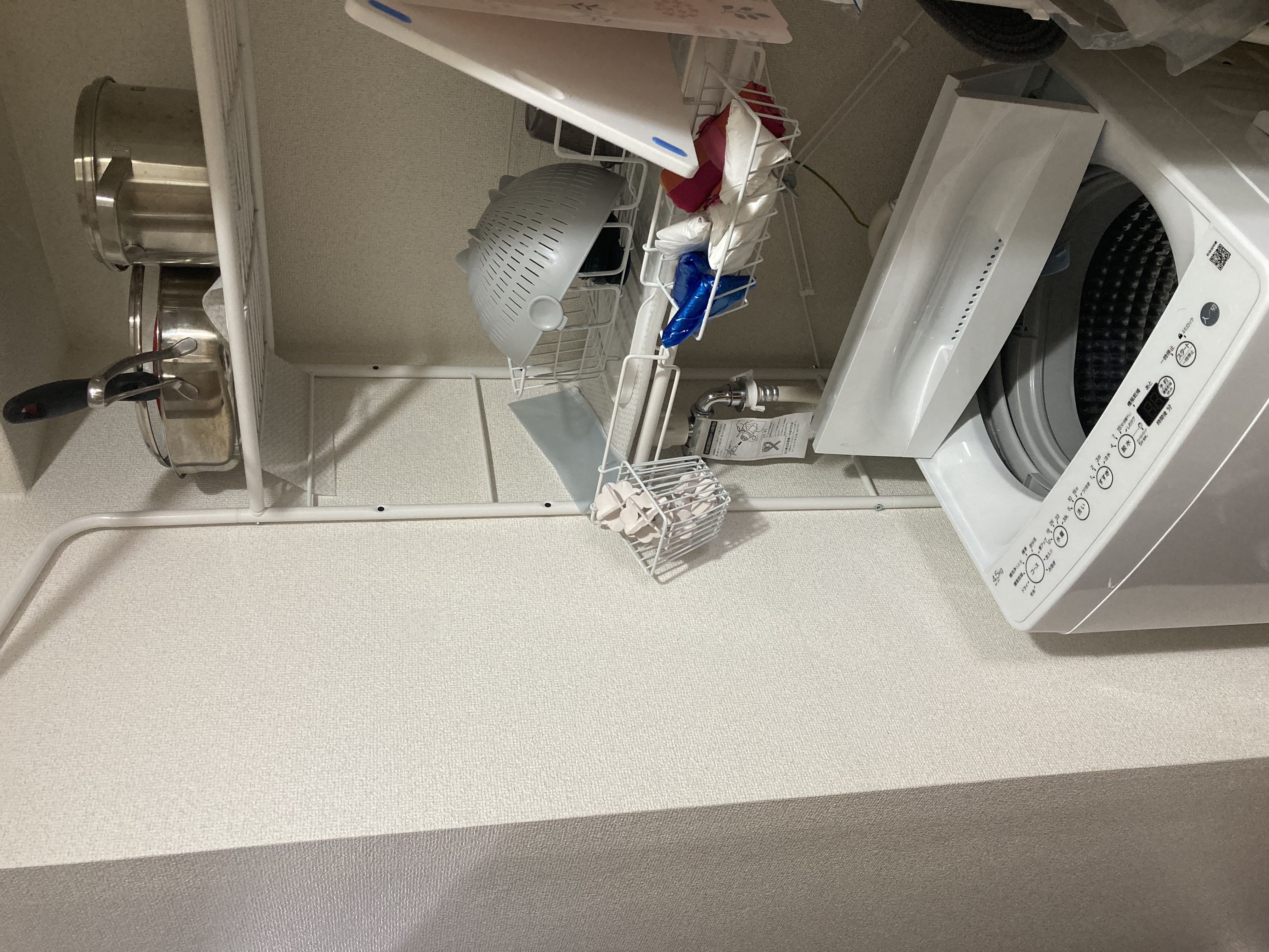 주방이 작고 수납공간이 없어 세탁기 위 공간도 수납공간을 만들고 주방용품으로 채우게 되었습니다.