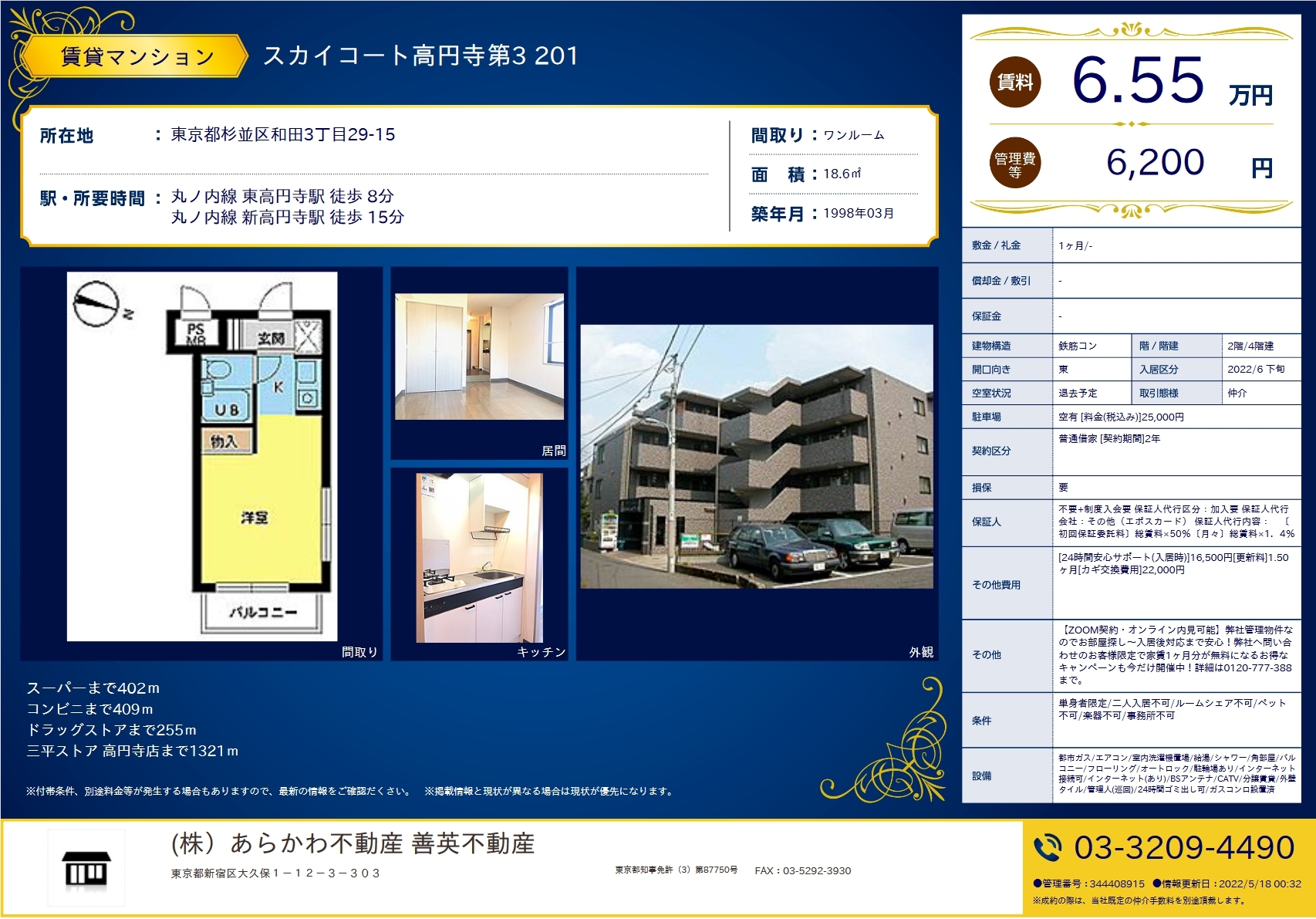 [メ마루노우치선](시1/레0)스기나미구 마루노우치선 히가시코엔지역 8분 1998년축 SC코엔지제3(201호-65,500엔+6,200엔)18.6㎡