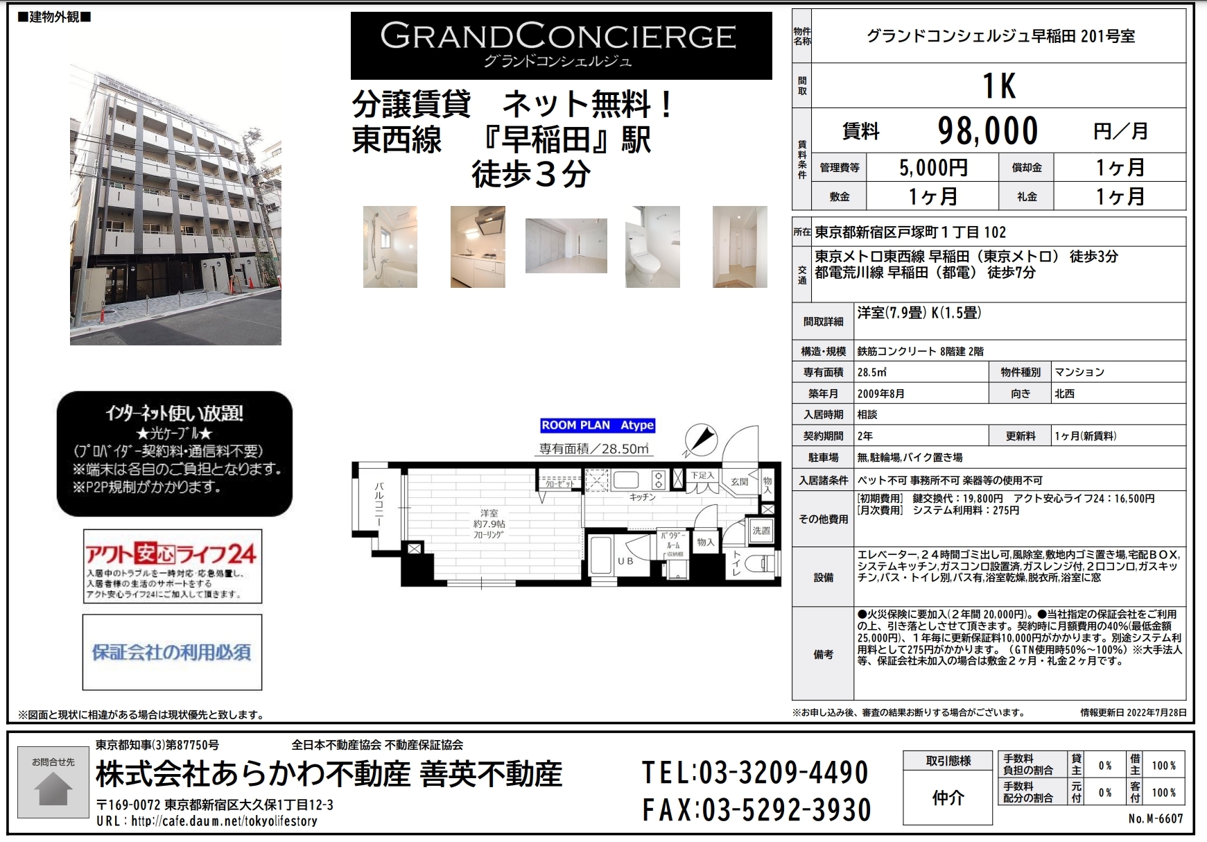 [メトロ토자이선](시1-상각/레1)도쿄 신주쿠구 토자이선 와세다역 3분 2009년築 GC와세다 1K(201호-98,000엔+5천엔)28.5㎡넷무료