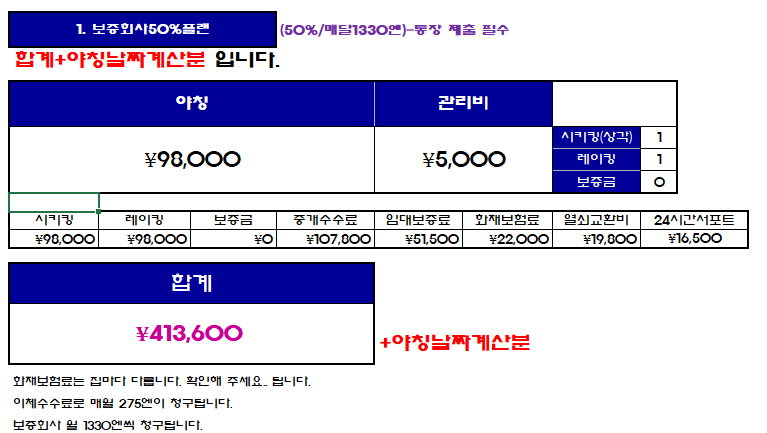 보증회사 50%+2천엔/월천엔