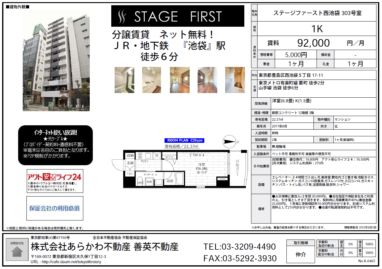 [メトロ유락쵸선](시1/레1)토시마구 유락쵸선 카나메쵸역 2분/야마노테선 2011년築 SF니시이케부쿠로(303호-92,000엔+5천엔)22.37㎡