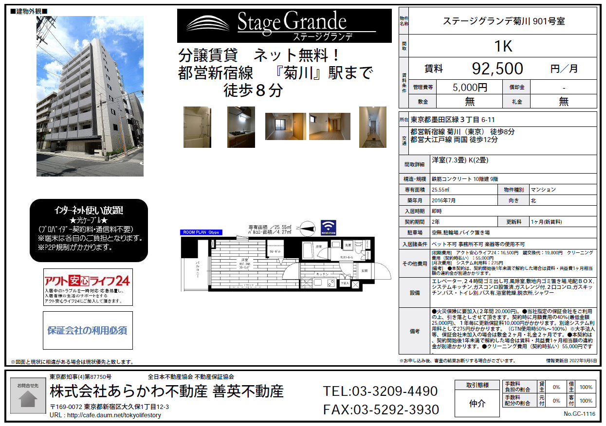 [都営신주쿠선](시0/레0)스미다구 토에이신주쿠선 키쿠카와역 8분 오에도선 2016년축 SG키쿠카와(901호-92500엔+5천엔)25.55㎡