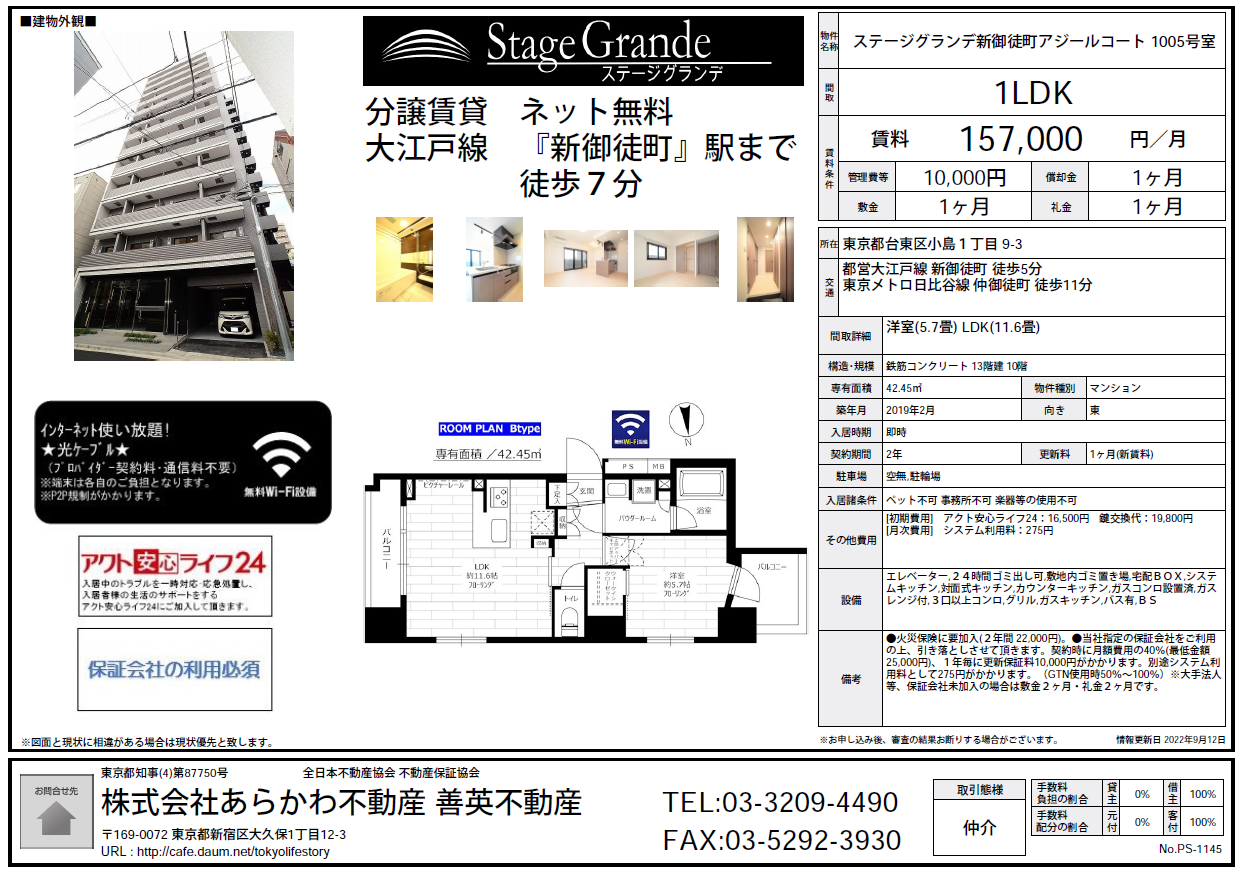 [都営오에도선](시1-상각/레1)타이토구 오에도선 신오카치마치역 5분 2019년축 SG신오카치마치AC(1005호-157,000엔+만엔)42.45㎡