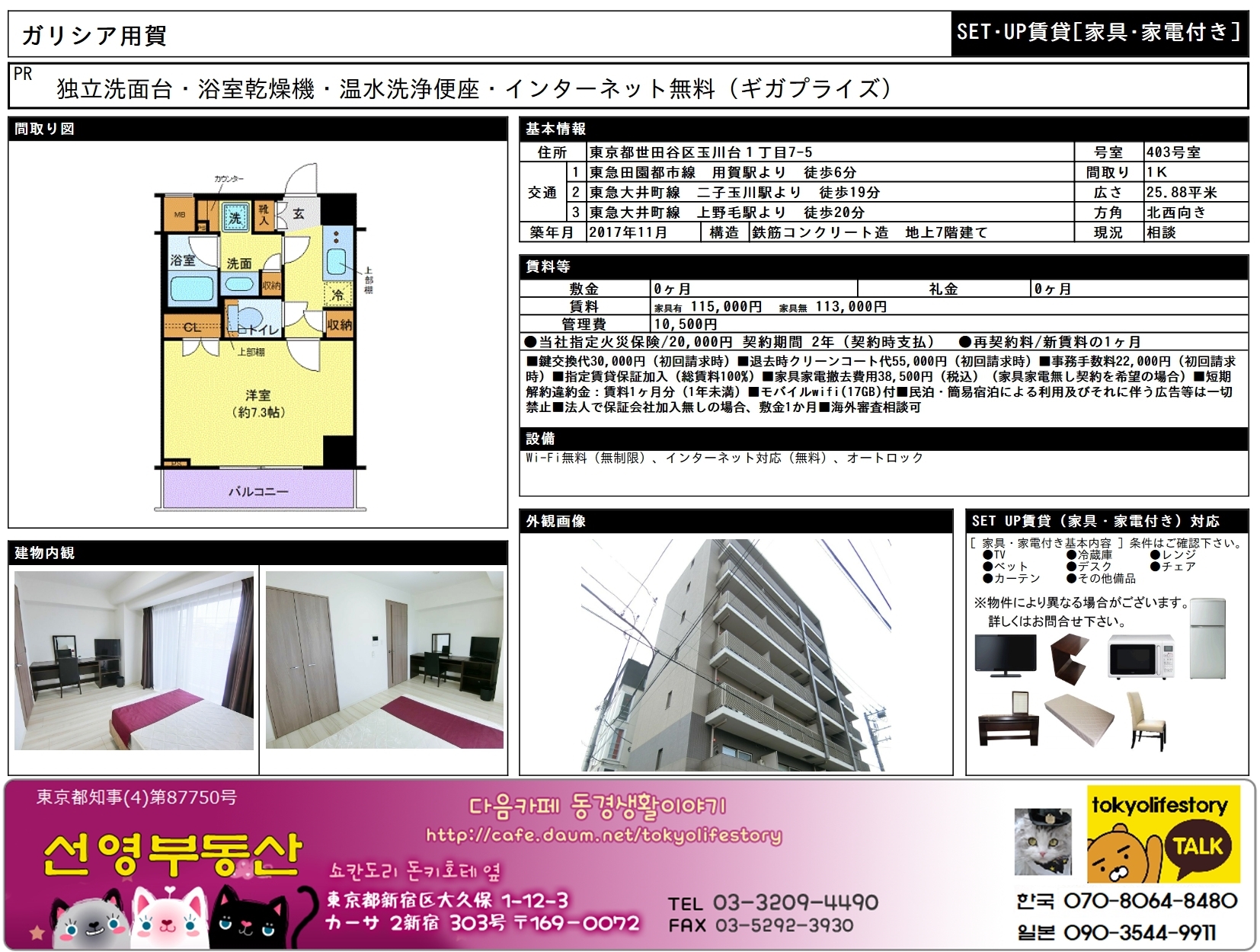 [스크랩] [풀옵션맨션]풀옵션(시0/레1)세타가야구 덴엔토시선 요가역 6분 2017년축 가리시아요가(403호-115000엔+10500엔)25.88㎡