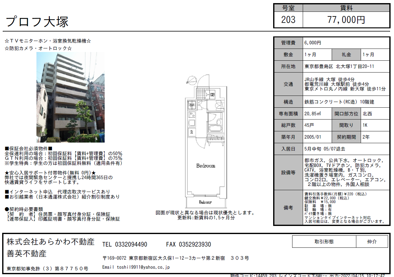 [특별한정캠페인](시0/레0)토시마구 야마노테선 오츠카역 4분 마루노우치선 11분 2005년築 프로후오츠카(203호-80800엔+6300엔)20.85㎡