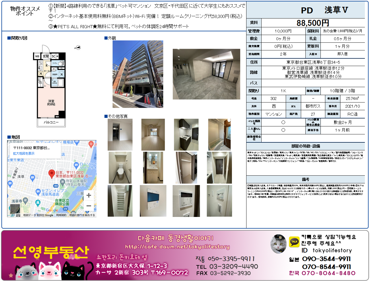 [メトロ긴자선](시0/레0.5)타이토구 아사쿠사역 긴자선 12분 2021년축 PD아사쿠사5 1K(302호-88,500엔+만엔)25.74㎡넷무료