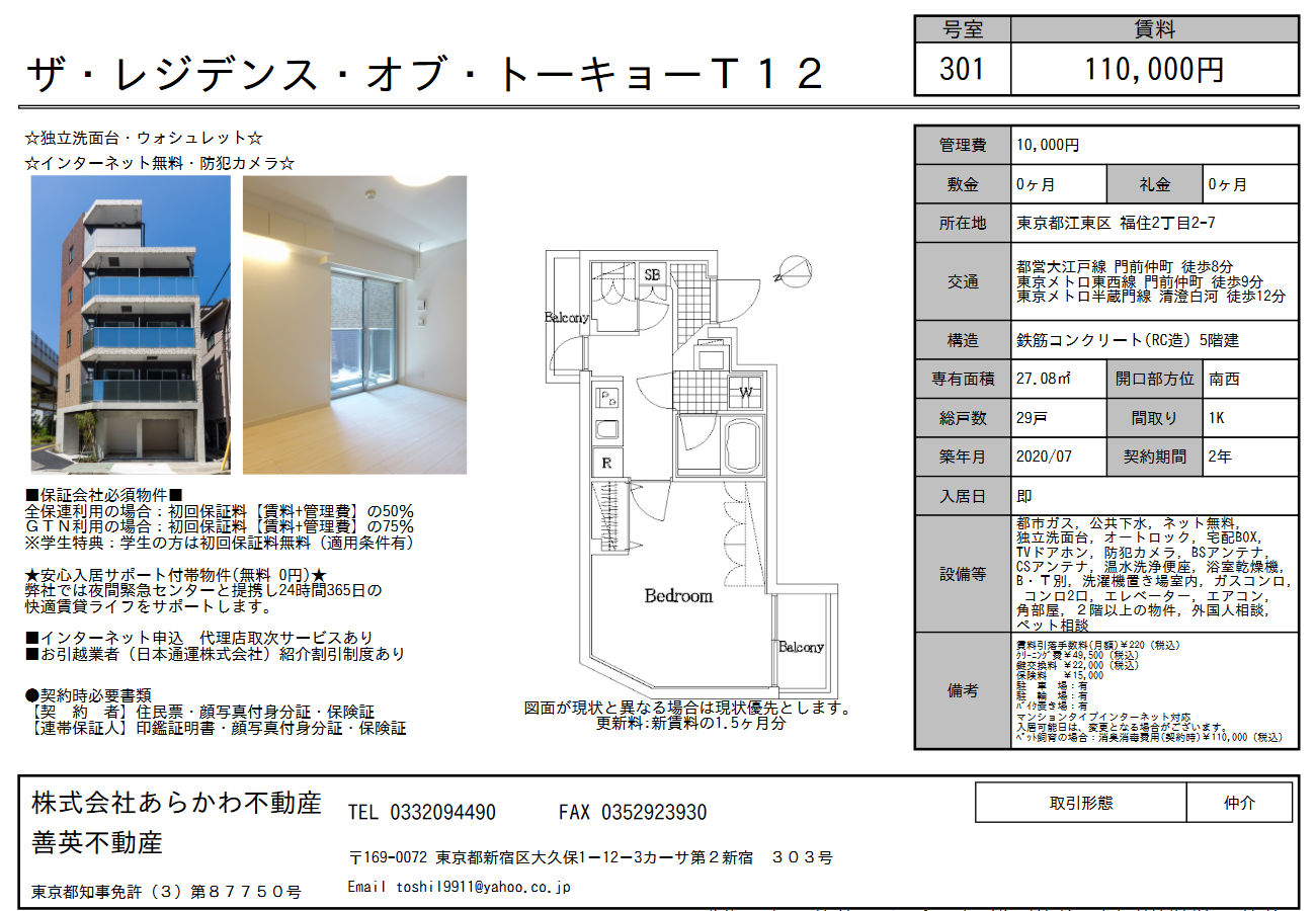 [都営오에도선](시0/레0)코토구 오에도선 몬젠나카쵸역 8분 2020년 더레지던스오브도쿄T12 (301호-110000엔+만엔)27.08㎡