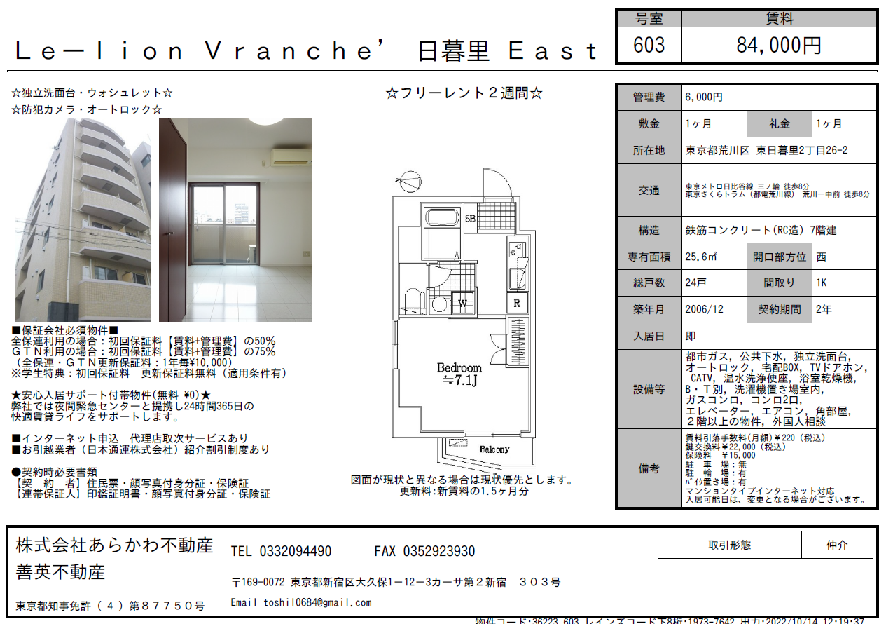 [월세2주공짜]프리2주(시0/레0)아카라와구 히비야선 미노와역 8분 2006년 르리온브란쉐닛뽀리이스트(603호-88200엔+6300엔)25.6㎡