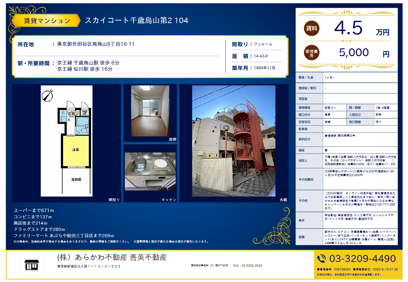 [스크랩] [추천2 한국가능](시1/레0)세타가야구 케이오선 치토세카라스야마역 6분 1984년築SC치토세카라스야마제2(104호-45,000엔+5천엔)14.43㎡