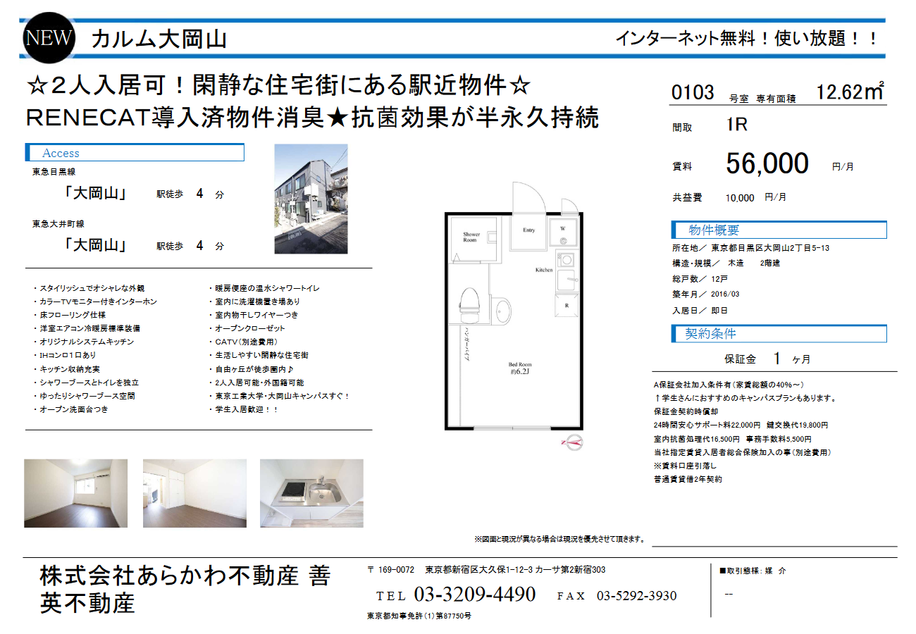 [스크랩] [추천2 한국가능](보1-상각)오타구 메구로선/토큐오이마치선 오오카야마역 4분 2016년築 칼므오오카야마(103호-56000엔+만엔)12.62㎡