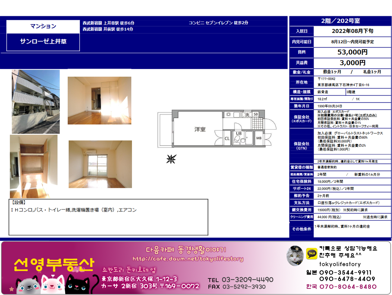 [스크랩] [한국신청가능](시1/레1)네리마구 세이부신주쿠선 카미이구사역 6분 1990년築 산로제카미이구사(202호-53000엔+3천엔)18.2㎡