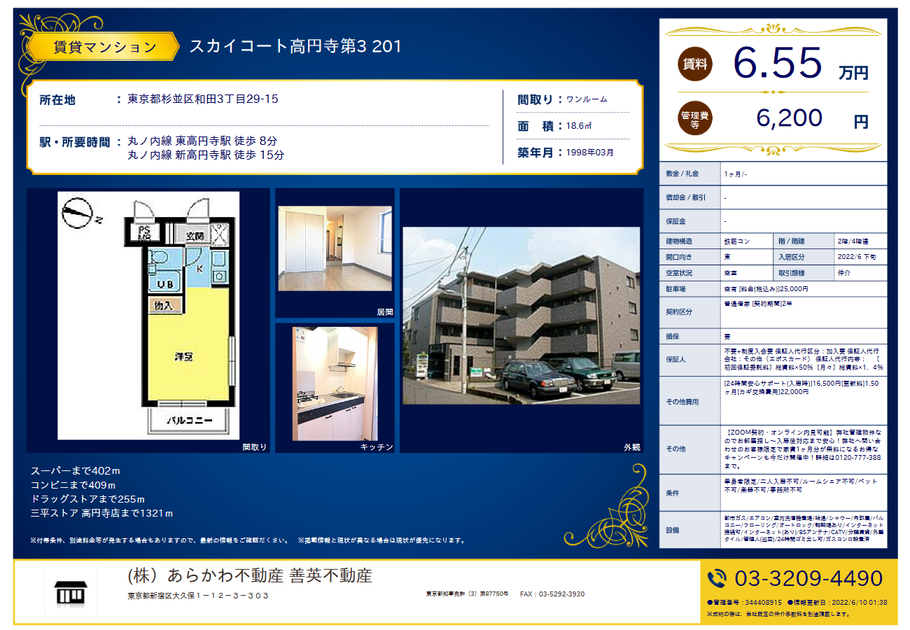 [스크랩] [추천2 한국가능](시1/레0)스기나미구 마루노우치선 히가시코엔지역 8분 1998년축 SC코엔지제3(201호-65,500엔+6,200엔)18.6㎡